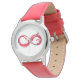Infinity symbole of continuous stream of red pouring into glass glass glass on white background.