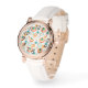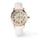 Cette montre pour femmes a un design moderne du milieu du siècle de cercles concentriques en or, orange et turquoise sur un arrière - plan blanc.