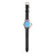 Cette montre étonnante présente une image d'art numérique d'une mignonne bébé licorne magique bleue garçon. Le corps principal de la licorne est bleu et la crinière et la queue sont de deux nuances de bleu différentes. La licorne a des sabots dorés et une corne en or brillant vif sur la tête. Il a un œil en forme de diamant bleu. La licorne a un grand sourire sur le visage.