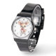 Une montre avec l'illustration d'un adorable cerf de bébé. Grands yeux grands oreilles avec une grande tête et des petits bois bruns. Portant un gros arc rouge.