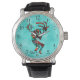 C'est une montre Kokopelli sud-ouest unique "One of a Kind"! Il présente un Kokopelli sud-ouest en Turquoise, Orange et Black Dancing et Playing the Flute Under the Sun...sur un Arrière - plan turquoise ! Design D'Art Original Par L'Artiste Kerry Miller.