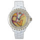 Les coeurs de pêche et d'orange se connectent comme des bulles qui dérivent ensemble. Un contour vert trace chaque coeur. Les points de couleur jaune pâle sont comme des confettis entre les coeurs. La peinture à l'aquarelle a une légère couche d'or et de rose sur le dessus. Les coeurs de rire sont un détail de la peinture "Laugh" du mot Inspirationnel. Créez des modèles de montre coeur d'amour customisé avec vos messages personnels et/ou photos. Utilisez le bouton "customiser". Les coeurs font de grands cadeaux personnalisés de montre poignet!