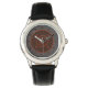 Ce mandala sur le thème de Leo représente une pierre d'onyx entourée du symbole du signe, de la constellation et du symbole alchimique du Feu parmi les fibres de cuivre rougeâtres et les tissages gravés. Cette montre est disponible dans une variété de tailles, de couleurs et de styles, y compris des tailles pour les enfants et les adultes.