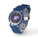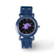 Montre-bracelet noir et violet avec un petit stegosaure mignon. C'est un beau cadeau pour les enfants qui aiment les dinosaures et les animaux de l'époque.