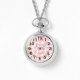 Cette montre pour femmes a un design moderne du milieu du siècle Valentin de mazes de coeur rouge éparpillés sur un champ de blanc.