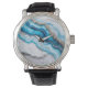 Des vagues de bleu vif et d'aqua traversent l'image, entrecoupées d'accents dorés chatoyants. Les couleurs tourbillonnent et se mélangent, donnant une sensation de mouvement et d'élégance.