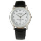 Montre masculine distinguée avec bande de cuir noir. Personnalisez avec du texte personnalisé. Elégante montre numérique romaine avec bande de cuir marron. Créez votre propre montre de fantaisie unique pour lui. Pièce d'époque classique avec chiffres romains, nom, date et couleur arrière - plan personnalisée. Belle idée cadeau de conservation pour les hommes se mariant, prenant sa retraite ou d'autres occasions. Faites votre propre garde-temps chic pour vos amis, famille, collègue, marié, etc. Aussi grand comme cadeau de Noël ou d'anniversaire de luxe pour grand-père, père, marin, capitaine de bateau, collègue, collègue, chef de compagnie, marié, employé, entraîneur, oncle, partenaire d'affaires, enseignant etc. Des idées cadeaux de luxe pour lui. Modèle de typographie de script élégant. Ajoutez votre nom et votre date imprimés sur le cadran.