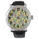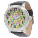 Cette montre pour hommes a un design moderne du milieu du siècle de lunes de croissant divisées horizontalement en trois couleurs, rose, bleu, lavande ou de mer, coupées en deux et éparpillées sur une grille avec un arrière - plan jaune. Si vous aimez le design mais que vous voulez des couleurs différentes, envoyez-moi un message.