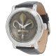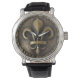 Montre à bracelet en cuir noir vintage pour hommes avec l'image d'un médaillon de fleur de lis en bronze. Voir bouton rond correspondant, charme rond, boucles d'oreilles, grand porte - clé en métal rond et collier rond. Voir l'ensemble de la collection Gemstones & Medallions Watch dans la section ACCESSORIES.