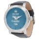 L'expression classique et populaire "Keep Calm and Carry On" est installée ici sur un arrière - plan cool Millennium Blue. Le design est orné d'une couronne royale et est basé sur la pièce originale de propagande de la Première Guerre mondiale produite par le gouvernement britannique.