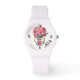 Montre ronde bracelet en silicone blanc moderne avec des numéros primaires élégants. Le visage présente un design charmant d'une maison de théière de conte de fées remplie de belles roses roses et de morceaux de feuilles verts. La théière est ornée de grands points verts, d'une porte rose vif, d'une poignée et d'une broche dorée brillantes. Les élégantes initiales en monogramme noir peuvent facilement être changées ou supprimées à l'aide du Modèle fourni. Ce design s'adapte aux montres en silicone noir et transparent.