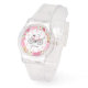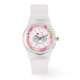 Une montre illustrant un vélo rose. Personnalisez avec votre nom. Arrière - plan est un design d'inspiration patchwork qui intègre en vichy, pois polka, zigzag chevron, rayures, paisley et motifs floraux.