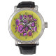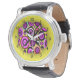 Motif moderne très simple et rétro aux formes circulaires dans les tons rose, orange, violet et blanc sur un arrière - plan jaune néon. Créé dans ArtRage 3 Studio Pro, avec pochoirs et calques, par Gina Lee Manley ©gleem Vous choisissez le style de montre et la couleur du bracelet.