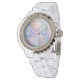 Une belle montre Rhinestone White Enamel pour les femmes avec le nom monogramme en bleu sur la mère de perle arrière - plan.