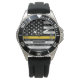 Montrez votre reconnaissance pour les hommes et les femmes de la police expédier avec cette mince ligne d'or drapeau américain style montre. Cette montre présente le drapeau américain en noir et blanc avec une ligne bleue traversant le centre. Une plaque d'identification noire se trouve au bas du garde-temps, avec votre nom ou celui de votre destinataire dans une police élégante mais forte. Cela fait un grand cadeau pour n'importe quel policier ou retraité débutant, ou peut-être pour un officier qui vient d'obtenir une promotion. C'est-à-dire le sergent du lieutenant de cadet, Rookie.