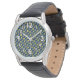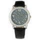 Cette montre masculine a un design moderne du milieu du siècle des ovales dans la marine avec des demi-cercles dans les tons jaune et gris dans eux sur un champ de noir.