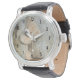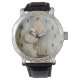 Une montre avec une photo de chéri d'un mignon ours en peluche, debout près d'un mur en bois rustique / fond.