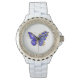 Bijoux, bleu, saphir, papillon aux fleurs pétillantes avec aile décorée de bleu, fleurs précieuses avec feuilles d'or sur arrière - plan blanc.