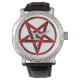 Pentagramme rouge, inversé et texturé dans un cercle, sur fond blanc. Symbole occulte. 666