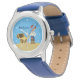 Des enfants cool de pirates regardent une boucanère portant une épée à côté d'un coffre au trésor rempli d'or sur une plage avec un arrière - plan bleu ciel. Customisez la montre de bracelet de ce garçon cool avec le nom de votre enfant en blanc. Ahoy Matey !
