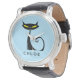 Ce design personnalisé de montre à poignet présente un chat noir "atomique" moderne rétro du milieu du siècle avec de grands yeux jaunes et une queue bouclée. Vous pouvez facilement modifier l'orthographe du texte, le style de police, la couleur et la taille avec le bouton Personnaliser Zazzle.