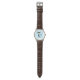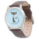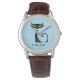 Cette montre en cuir marron classique et personnalisée présente un chat noir "atomique" moderne rétro du milieu du siècle avec de grands yeux jaunes et une queue bouclée. Vous pouvez facilement modifier l'orthographe du texte, le style de police, la couleur et la taille avec le bouton Personnaliser Zazzle.