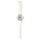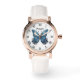 La montre pour femmes est ornée d'une adorable illustration de papillon aux tons bleus, avec de l'espace pour ajouter un nom dans une élégante typographie. La plaque de visage montre a des chiffres romains.