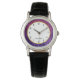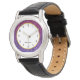 Une montre au design soigné et élégant. L'arrière - plan composé de pierres de parties scintillant brillantes rose et violet. Une ambiance tendance et féminine. Un cercle avec une bordure en faux feuille d'or superposée avec votre nom à l'intérieur.