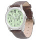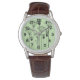 Cette montre pour hommes a un design moderne du milieu du siècle des plantes faits de lignes, de cercles, de triangles, de rectangles et de carrés en noir sur un arrière - plan vert.