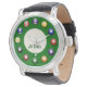 Cette montre présente un ensemble de ballons de piscine numérotés de couleur, marquant l'heure de 1 à 12 autour de la circonférence de l'horloge, sur un lit vert. Il y a un cercle intérieur de beige avec un espace réservé au texte pour votre nom. Sélectionnez un style de montre différent avec les options personnalisées.