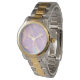Une montre élégante au poignet avec un visage éthérée reflétant des couleurs irisées subtiles.