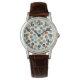 Cette montre pour femmes a un design géométrique de points bleus, verts et marron.