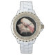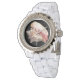 Grande montre pour femme coquille de conque rose. Jolie image d'un coquillage connu pour sa teinte rose à l'intérieur, posé sur fond noir, entouré de strass. Ou choisissez ce design tropical sur n'importe quel type de montre.