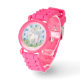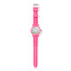 Cette montre à cheval pour filles dispose d'un joli poney avec une crinière et une queue roses. Elle est debout dans un champ de fleurs et un beau arrière - plan bleu ciel avec le soleil culminant à travers de charmants nuages blancs bouffants.