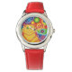 Super bébé ! Un chat rayé jaune et orange avec des fouets tourbillonnants et un arrière - plan psychédélique à motif arc-en-ciel. Montre avec un design personnalisable jaune, orange, rouge, bleu, vert, rose, violet et blanc pour vous permettre de personnaliser avec votre propre texte, images et idées. Disponible dans toutes les options de style. Image créée à partir d'un dessin original numériquement crayon de couleur améliorée.