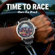 This bold watch face features a vibrant purple hot rod car with yellow and orange flames painted on its side, speeding along a reflective road. A large, bright full moon illuminates the dark, stylized landscape with distant trees. The overall design creates a powerful and dynamic night scene for automotive enthusiasts.