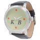 Un look rétro avec quatre points rouges, qui ont l'air en trois dimensions, aux positions 12, 3, 6 et 9. En bas du centre de la face, personnalisez avec deux initiales qui auront des ombres déroulantes. Customisez/Modifiez la couleur de l'arrière - plan à votre goût.