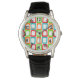 Cette montre pour hommes a un design moderne du milieu du siècle, avec des rectangles torsadés répétitifs en rouge, orange, vert et turquoise.
