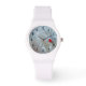 Une montre avec une photo nature pittoresque montrant un cardinal rouge vif. Contrasté par rapport à un arrière-plan hivernal extérieur avec la neige tombant doucement vers le bas.
