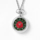 Photo d'une rose rouge dans un jardin. La fleur est entièrement ouverte exposant les tiges jaunes du centre. Une paire de bourgeons rouges pousse derrière la fleur principale. L'arrière - plan est plein de feuilles verts. Il y a un cadran blanc d'heures et de minutes pour cette photo de fleur. Copyright ©Kimberly J Tilley.