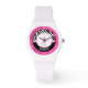 Montre de patinage artistique en zèbre en rose. Une silhouette de patinage artistique pose à l'intérieur d'un cercle et il y a une bannière "pois-pois" pour le contraste. Ajoutez votre propre nom avant de commander ! En outre, utilisez le bouton "customiser" pour plus d'options, y compris une police différente! ©gollygirls.com