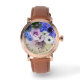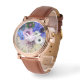 Elégante montre florale, bleu, roses blanches roses et anémones sur arrière - plan gris avec pierres précieuses imprimées rose.