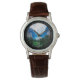 Une montre avec une belle photo d'une scène nature agréable et tranquille. Forêt verdoyante à l'avant et montagnes bleues à l'arrière. Avec un ciel blanc nuageux et onirique. Ambiance mélancolique et magique.