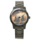 Super cool et rustique, cette montre de l'ouest du pays compte trois cowboys à cheval avec un coucher de soleil poussiéreux derrière eux.