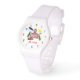 Une montre pour les enseignants avec un dessin crayon inspiré de l'illustration d'une école. Personnalisez avec le nom sous le dessin. Les chiffres sont multicolores.