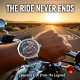 This vibrant watch face features a red and black sport motorcycle driving on a road. In the background, a large American flag is dramatically set against a sunset sky with a prominent full moon. The colorful scene includes reflections on the wet road and subtle foreground foliage, creating a bold and patriotic design for motorcycle enthusiasts.
