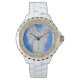 L'art montre un ange pastel doux contre un arrière - plan étoilé bleu doux. L'image a d'abord été peinte en acrylique puis finie en pastel pour créer une couleur douce et lumineuse. Les produits avec cet ange sont parfaits pour Noël et autres vacances! Créez des modèles de montres d'ange gardien customisés avec vos messages personnels et/ou vos photos. Utilisez le bouton "customiser". L'art ange gardien fait de grands cadeaux personnalisés de montre poignet!