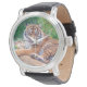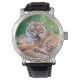 Close up photograph of a chilled out tiger relaxing on wood with green foliage behind.