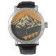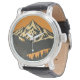 Un design d'inspiration vintage avec un majestueux sommet de montagne baigné par la chaleur d'un soleil couchant. La montagne est entourée d'une forêt dense de pins, créant une atmosphère paisible et sereine.