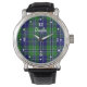 Élégante montre à poignet en cuir, avec le classique clan bleu, vert et blanc motif en plaid Douglas, sur le visage, avec des nombres blancs et des points pour les heures. Texte personnalisé blanc lit Abercrombie, et peut être personnalisé pour lire ce que vous voulez.